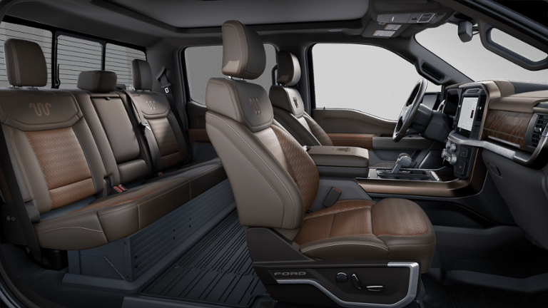 Equipment Group 601A High, 3.5L PowerBoost Full-Hybrid V6, 4WD, ', 14 Speakers, 4-Wheel Disc Brakes, ABS brakes, Adjustable pedals, Air Conditioning, Alloy wheels, AM/FM radio: SiriusXM with 360L, Auto High-beam Headlights, Auto tilt-away steering wheel, Auto-dimming door mirrors, Auto-dimming Rear-View mirror, Automatic temperature control, Brake assist, Chrome wheels, Compass, Delay-off headlights, Driver door bin, Driver vanity mirror, Dual front impact airbags, Dual front side impact airbags, Electronic Stability Control, Emergency communication system: SYNC 4 911 Assist, Front Bucket Seats, Front Center Armrest, Front dual zone A/C, Front fog lights, Front License Plate Bracket, Front reading lights, Front wheel independent suspension, Fully automatic headlights, Garage door transmitter, Genuine wood dashboard insert, Heads-Up Display, Heated door mirrors, Heated front seats, Heated rear seats, Heated steering wheel, Illuminated entry, Internet access capable: FordPass Connect 5G, King Ranch Multicontour Leather Bucket Seats, Leather steering wheel, Low tire pressure warning, Memory seat, Navigation system: Connected Navigation, Occupant sensing airbag, Outside temperature display, Overhead airbag, Overhead console, Panic alarm, Passenger door bin, Passenger vanity mirror, Pedal memory, Power door mirrors, Power driver seat, Power moonroof, Power passenger seat, Power steering, Power windows, Radio data system, Radio: B&O Unleashed Sound System by Bang & Olufsen, Rain sensing wipers, Rear reading lights, Rear seat center armrest, Rear step bumper, Rear window defroster, Remote keyless entry, Security system, Speed control, Split folding rear seat, Steering wheel memory, Steering wheel mounted audio controls, SYNC 4 w/Enhanced Voice Recognition, Tachometer, Telescoping steering wheel, Tilt steering wheel, Traction control, Trip computer, Turn signal indicator mirrors, Variably intermittent wipers, Ventilated front seats, Voltmeter, Wheel Well Liner, and Wheels: 20 Chrome-Like PVD.